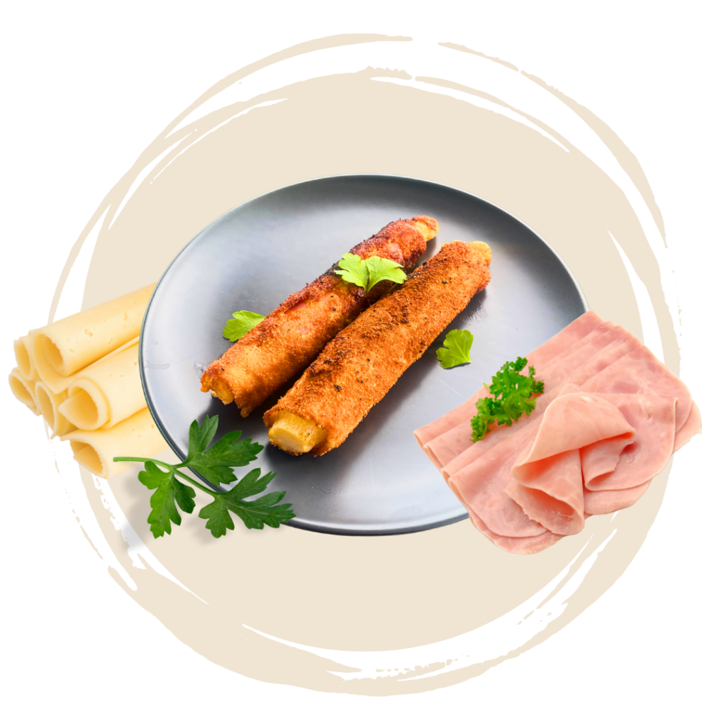 Anschließend mit Käse und Kochschinken umwickeln und vorsichtig durch die Panierstraße wälzen.