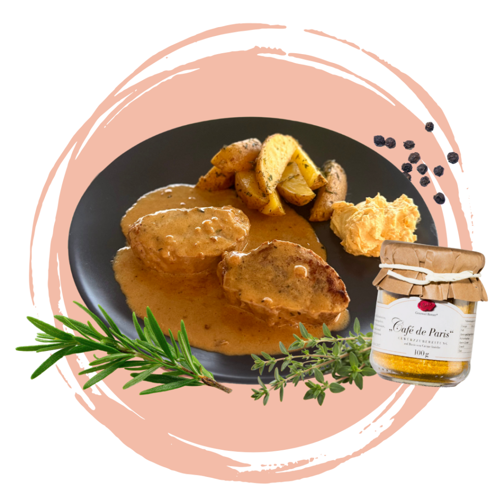 Die Medaillons aus der Pfanne nehmen, Zwiebeln und Knoblauch in die Pfanne geben und mit Hühnerbrühe ablöschen. Dann 2 Becher Sahne hinzugeben, würzen und mit derdelikatess Rahmsoße leicht andicken.