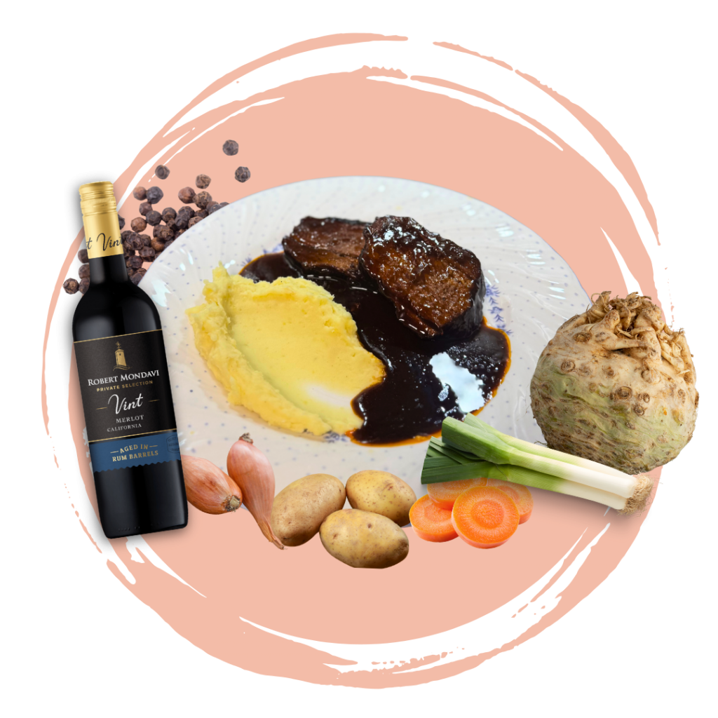 Das ganze einkochen lassen, den Braten hineinsetzen und den ganzen Topf 2h bei 180° im Ofen garen. Anschließend das Fleisch wieder herausnehmen, Soße absieben und eine zweite Flasche Merlot in einem separaten Topf in geschmorten Schalotten reduzieren.