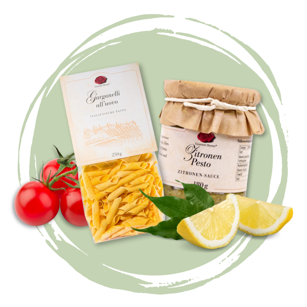 Pasta al dente & 1 Kelle Pastawasser zu den Tomaten geben, Pesto unterrühren, Würzen und den Saft einer ganzen Zitrone beigeben.