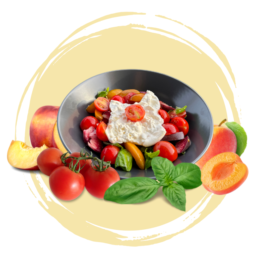 Die Tomaten und das Obst in mundgerechte Stücke schneiden, das Basilikum grob zupfen und etwas Zitronenöl (nach Wunsch auch mit Olivenöl gemischt) nach Geschmack über den Obstsalat geben. Das ganze ein paar Minuten ziehen lassen und mit Mozzarella oder Burrata anrichten.