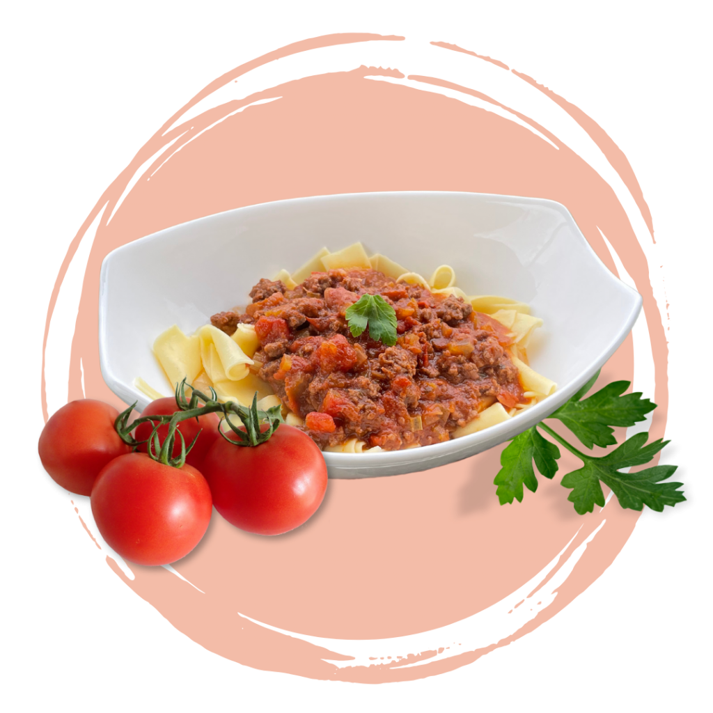 Dann das Hackfleisch mit Tomatenmark dazugeben und zusammen anbraten. Anschließend mit Rinderfont ablöschen, ein wenig reduzieren lassen und die passierten / gestückelten Tomaten dazugeben.